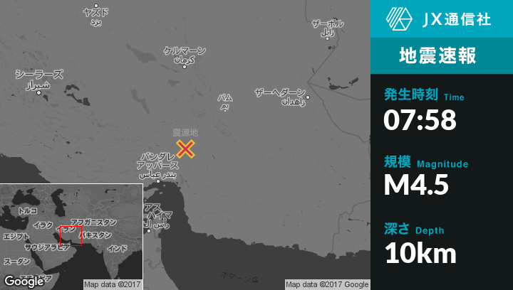 12月24日 07:58頃、イランのMinabから北113kmの地点でM4.5の地震がありました。