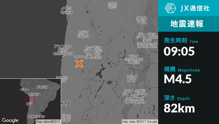 | 震源地 | チリのAntofagastaから東南東124kmの地点 |