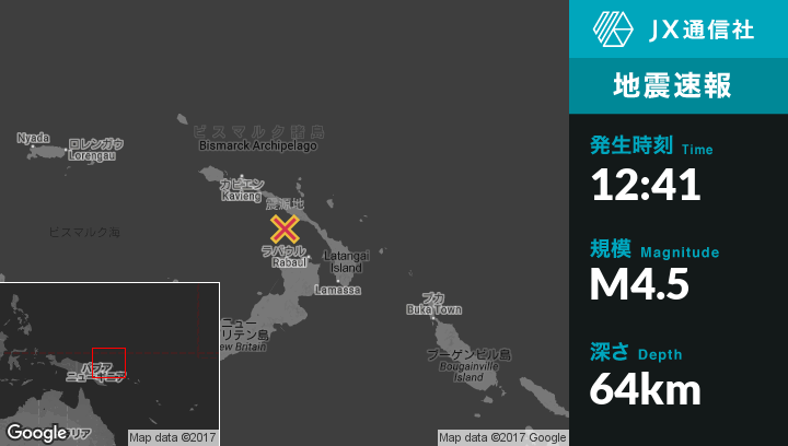 12月29日 12:41頃、パプアニューギニアのNamatanaiから西北西86kmの地点でM4.5の地震がありました。