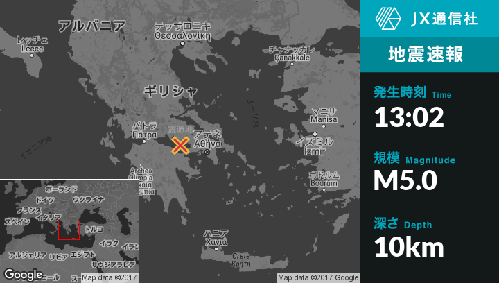 | 震源地 | ギリシャのKoriniから西9kmの地点 |