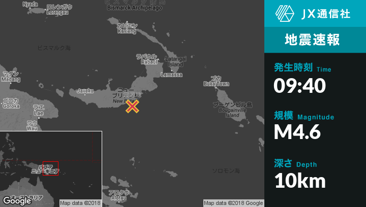 1月01日 09:40頃、パプアニューギニアのKimbeから東南東117kmの地点でM4.6の地震がありました。