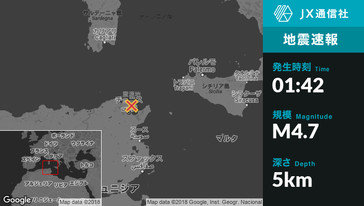 | 震源地 | チュニジアのGhar al Milhから東南東9kmの地点 |