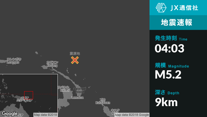 3月10日 04:03頃、パプアニューギニアのNamatanaiから北199kmの地点でM5.2の地震がありました。