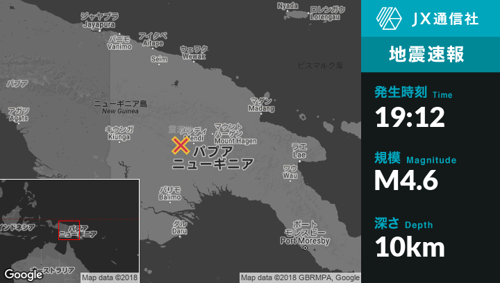 3月14日 19:12頃、パプアニューギニアのMendiから西47kmの地点でM4.6の地震がありました。