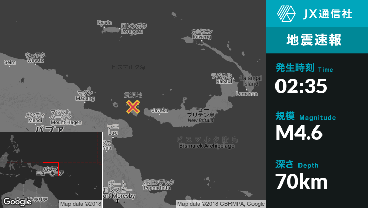3月18日 02:35頃、パプアニューギニアのFinschhafenから北145kmの地点でM4.6の地震がありました。