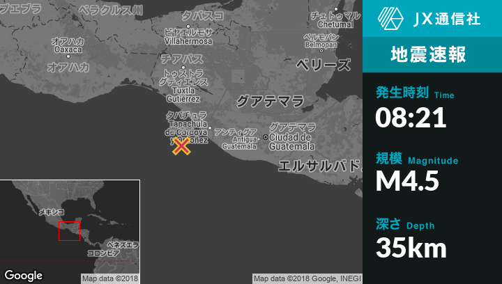 3月27日 08:21頃、メキシコのPuerto Maderoから西南西84kmの地点でM4.5の地震がありました。
