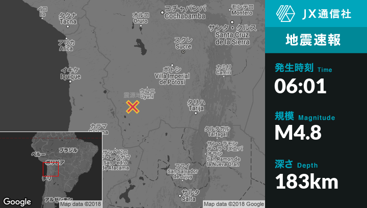 4月02日 06:01頃、ボリビアのUyuniから南西99kmの地点でM4.8の地震がありました。