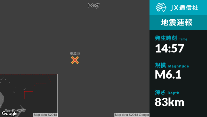 | 震源地 | トンガの`Ohonuaから南南西429kmの地点 |