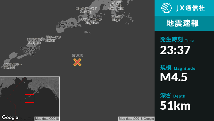 4月19日 23:37頃、アラスカのFalse Passから南185kmの地点でM4.5の地震がありました。