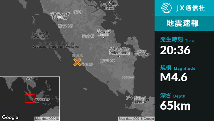 | 震源地 | インドネシアのBengkuluから北西87kmの地点 |