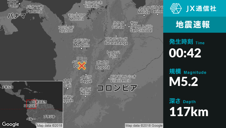 4月24日 00:42頃、コロンビアのNeiraから西北西2kmの地点でM5.2の地震がありました。