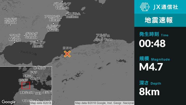 4月24日 00:48頃、アルジェリアのMostaganemから北北西9kmの地点でM4.7の地震がありました。
