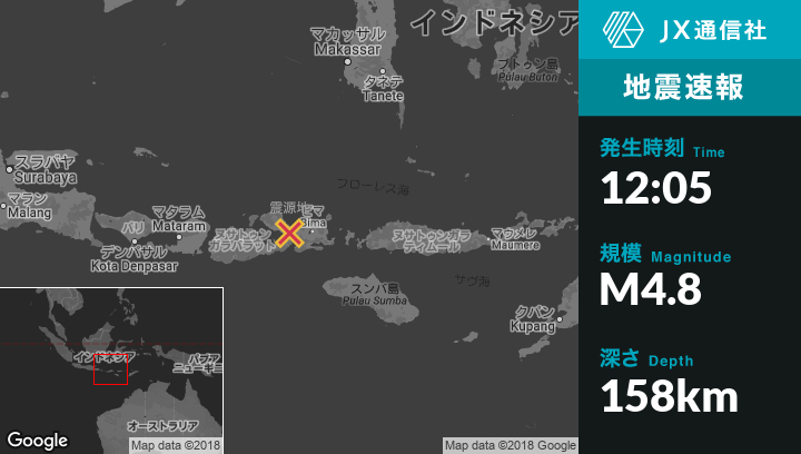4月24日 12:05頃、インドネシアのPaliから西南西3kmの地点でM4.8の地震がありました。