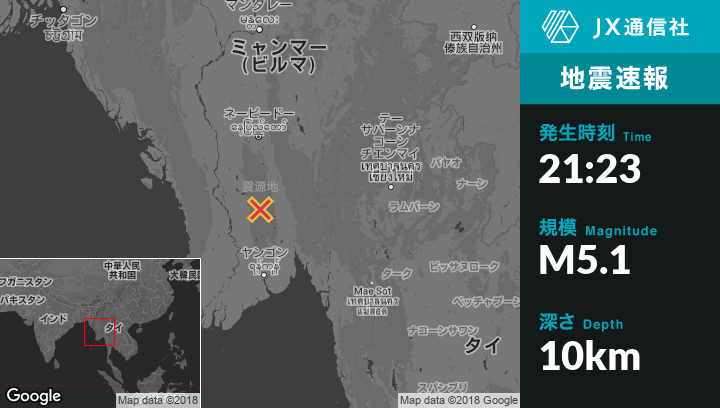 4月24日 21:23頃、ミャンマーのPyuから西南西37kmの地点でM5.1の地震がありました。