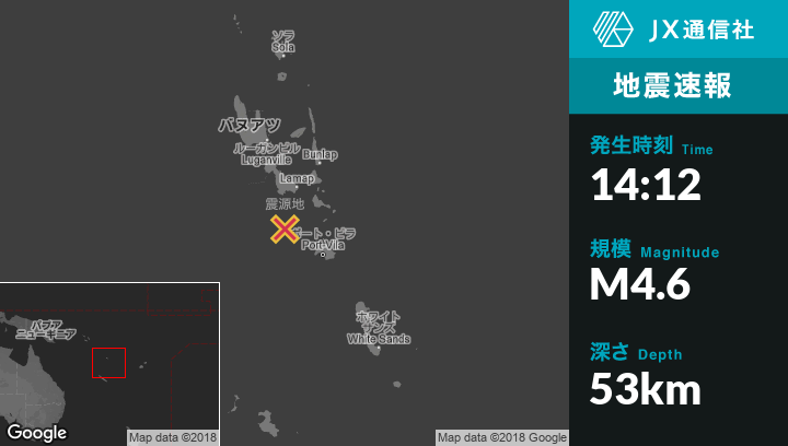 4月25日 14:12頃、バヌアツのPort-Vilaから北西104kmの地点でM4.6の地震がありました。