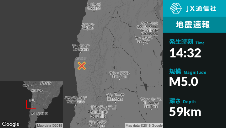 4月26日 14:32頃、チリのOvalleから南3kmの地点でM5.0の地震がありました。