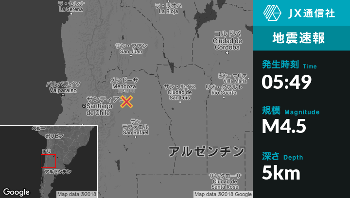 4月29日 05:49頃、アルゼンチンのSan Martinから西南西29kmの地点でM4.5の地震がありました。