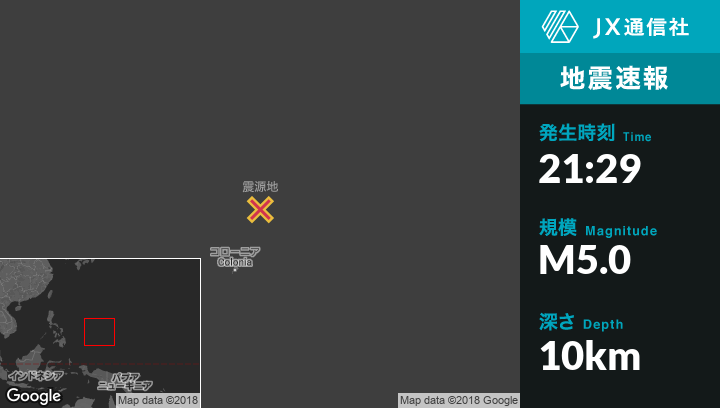 4月29日 21:29頃、ミクロネシアのRumungから北北東157kmの地点でM5.0の地震がありました。