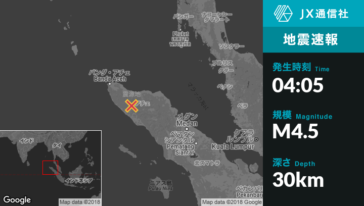 4月30日 04:05頃、インドネシアのReuleuetから南55kmの地点でM4.5の地震がありました。