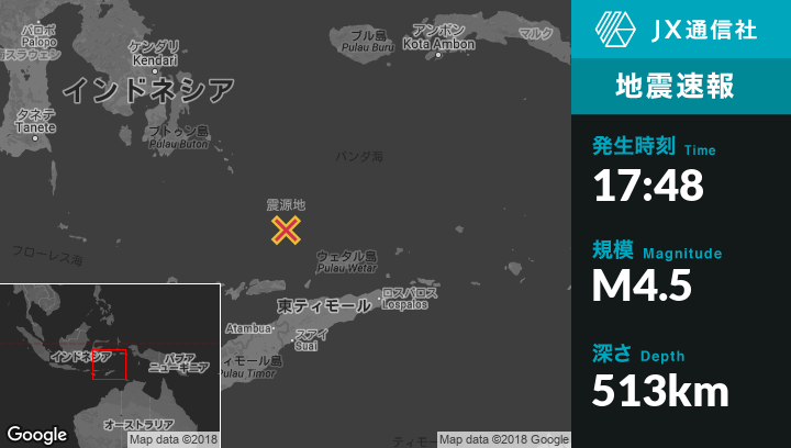5月01日 17:48頃、東ティモールのDiliから北北西175kmの地点でM4.5の地震がありました。