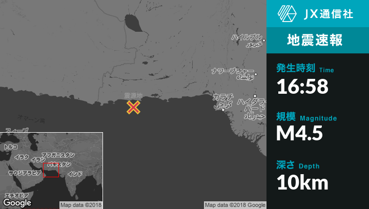 5月03日 16:58頃、パキスタンのPasniから西南西38kmの地点でM4.5の地震がありました。