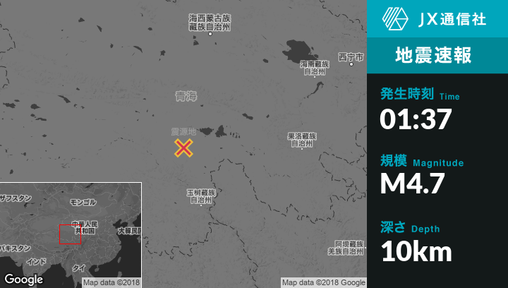 5月05日 01:37頃、中国のGyeguから北北西182kmの地点でM4.7の地震がありました。