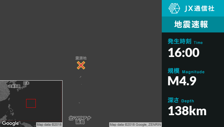 5月06日 16:00頃、北マリアナ諸島のAgrihanから北北東27kmの地点でM4.9の地震がありました。