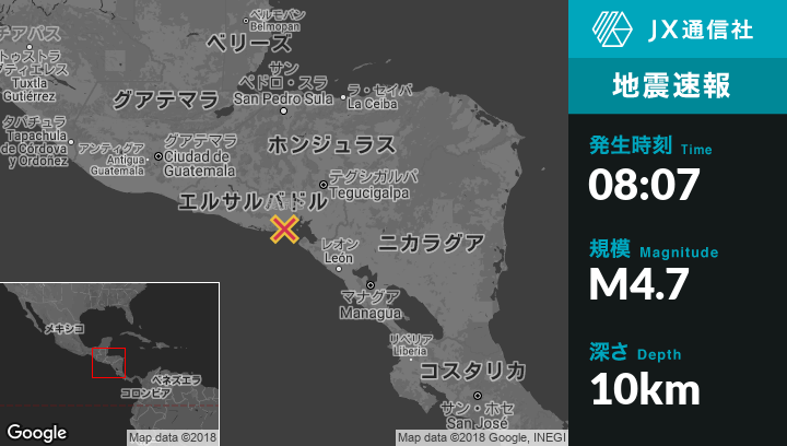 5月09日 08:07頃、エルサルバドルのSan Alejoから南11kmの地点でM4.7の地震がありました。