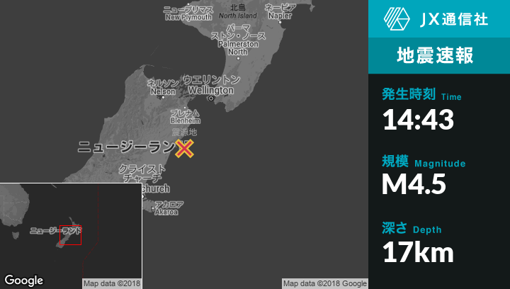 5月12日 14:43頃、ニュージーランドのKaikouraから東北東21kmの地点でM4.5の地震がありました。