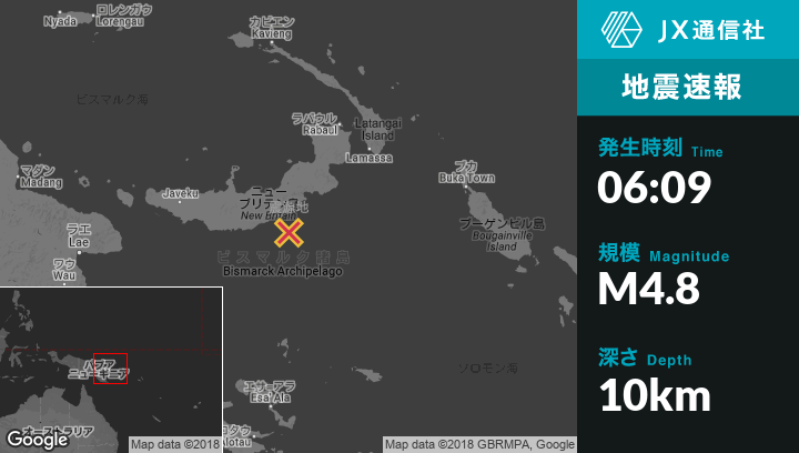| 震源地 | パプアニューギニアのKimbeから東南東132kmの地点 |