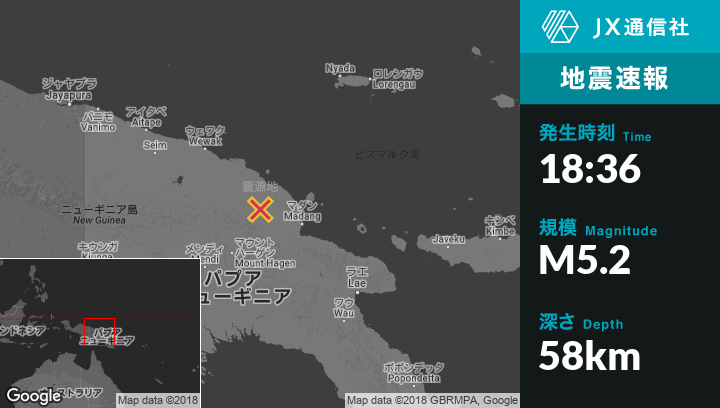 5月19日 18:36頃、パプアニューギニアのMadangから西北西114kmの地点でM5.2の地震がありました。