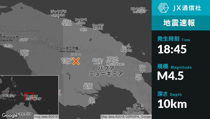 5月20日 18:45頃、パプアニューギニアのKiungaから東北東87kmの地点でM4.5の地震がありました。