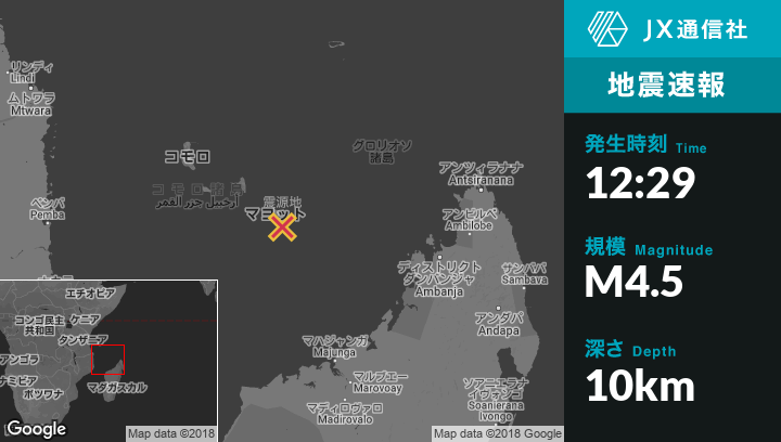 5月22日 12:29頃、マヨットのBandreleから東南東7kmの地点でM4.5の地震がありました。