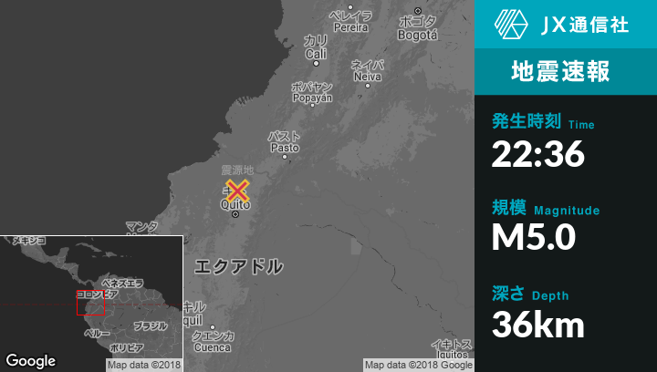 5月22日 22:36頃、エクアドルのCotacachiから北西27kmの地点でM5.0の地震がありました。