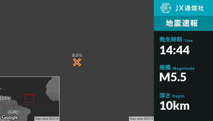 5月23日 14:44頃、ブラジルのAcarauから北北東1217kmの地点でM5.5の地震がありました。
