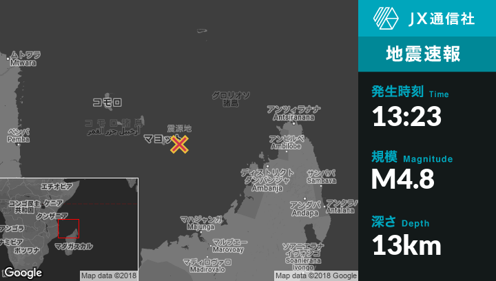 5月24日 13:23頃、マヨットのPamandziから東39kmの地点でM4.8の地震がありました。