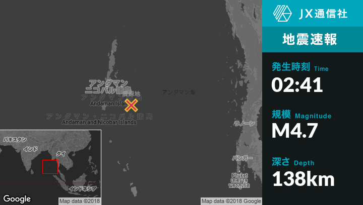 5月26日 02:41頃、インドのPort Blairから南東134kmの地点でM4.7の地震がありました。