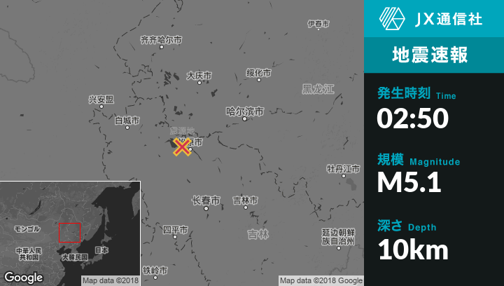 5月28日 02:50頃、中国のFuyuから西北西22kmの地点でM5.1の地震がありました。