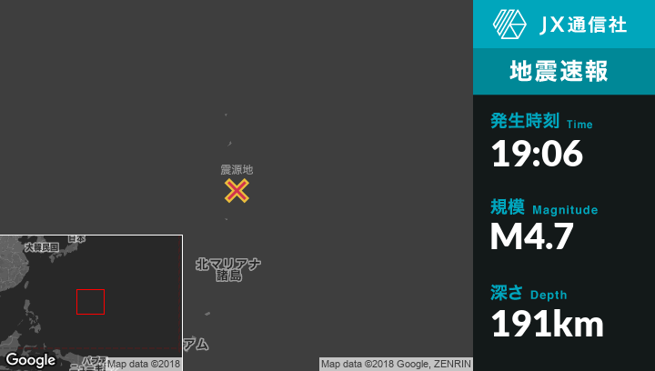 6月01日 19:06頃、北マリアナ諸島のAnatahanから北北東91kmの地点でM4.7の地震がありました。
