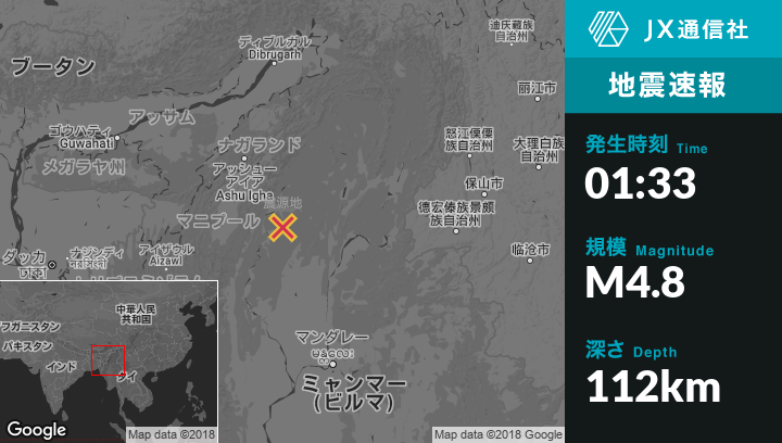 | 震源地 | インドのYairipokから東103kmの地点 |