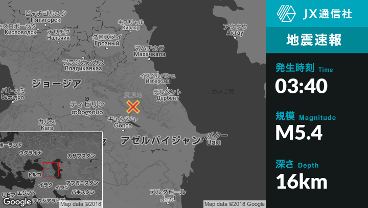 6月06日 03:40頃、アゼルバイジャンのCinarliから北西12kmの地点でM5.4の地震がありました。