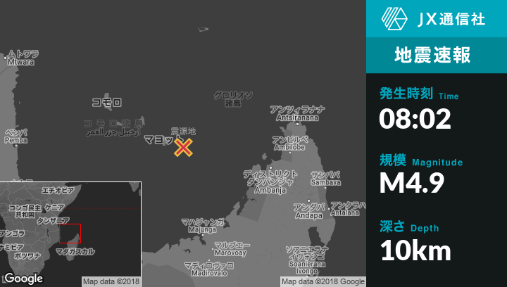 6月06日 08:02頃、マヨットのPamandziから東南東50kmの地点でM4.9の地震がありました。