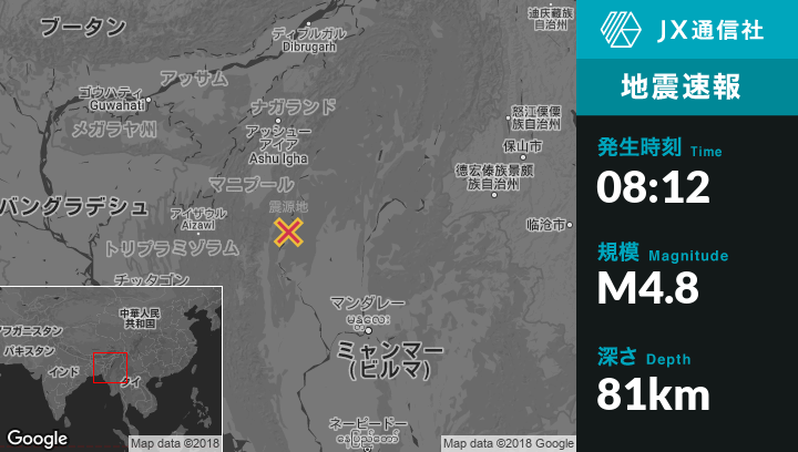 | 震源地 | ミャンマーのMawlaikから北北東28kmの地点 |