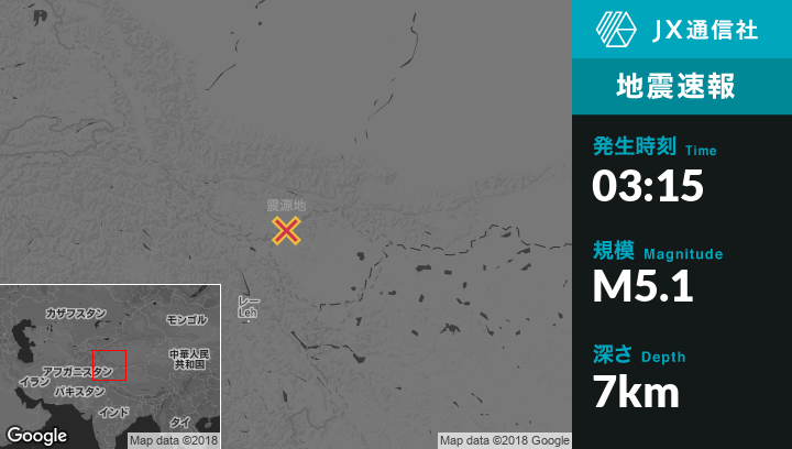 6月07日 03:15頃、インドのThangから東北東170kmの地点でM5.1の地震がありました。