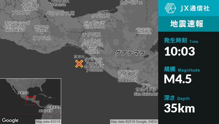 6月10日 10:03頃、メキシコのTres Picosから南南西100kmの地点でM4.5の地震がありました。