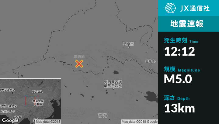 6月17日 12:12頃、中国のDa Qaidam Huから北北西122kmの地点でM5.0の地震がありました。