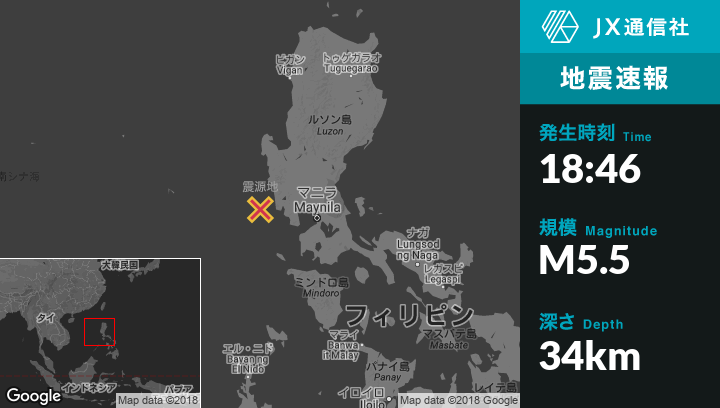 6月17日 18:46頃、フィリピンのSan Nicolasから西37kmの地点でM5.5の地震がありました。