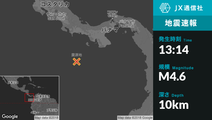 6月18日 13:14頃、パナマのPunta de Buricaから南193kmの地点でM4.6の地震がありました。
