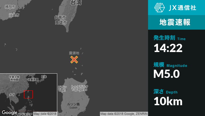 6月18日 14:22頃、フィリピンのSabtangから西南西66kmの地点でM5.0の地震がありました。