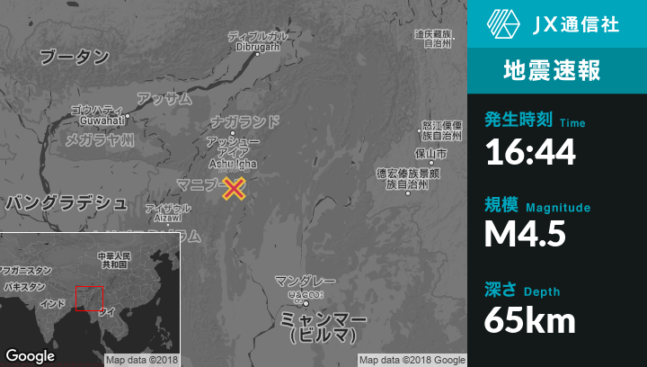 6月20日 16:44頃、インドのYairipokから東26kmの地点でM4.5の地震がありました。